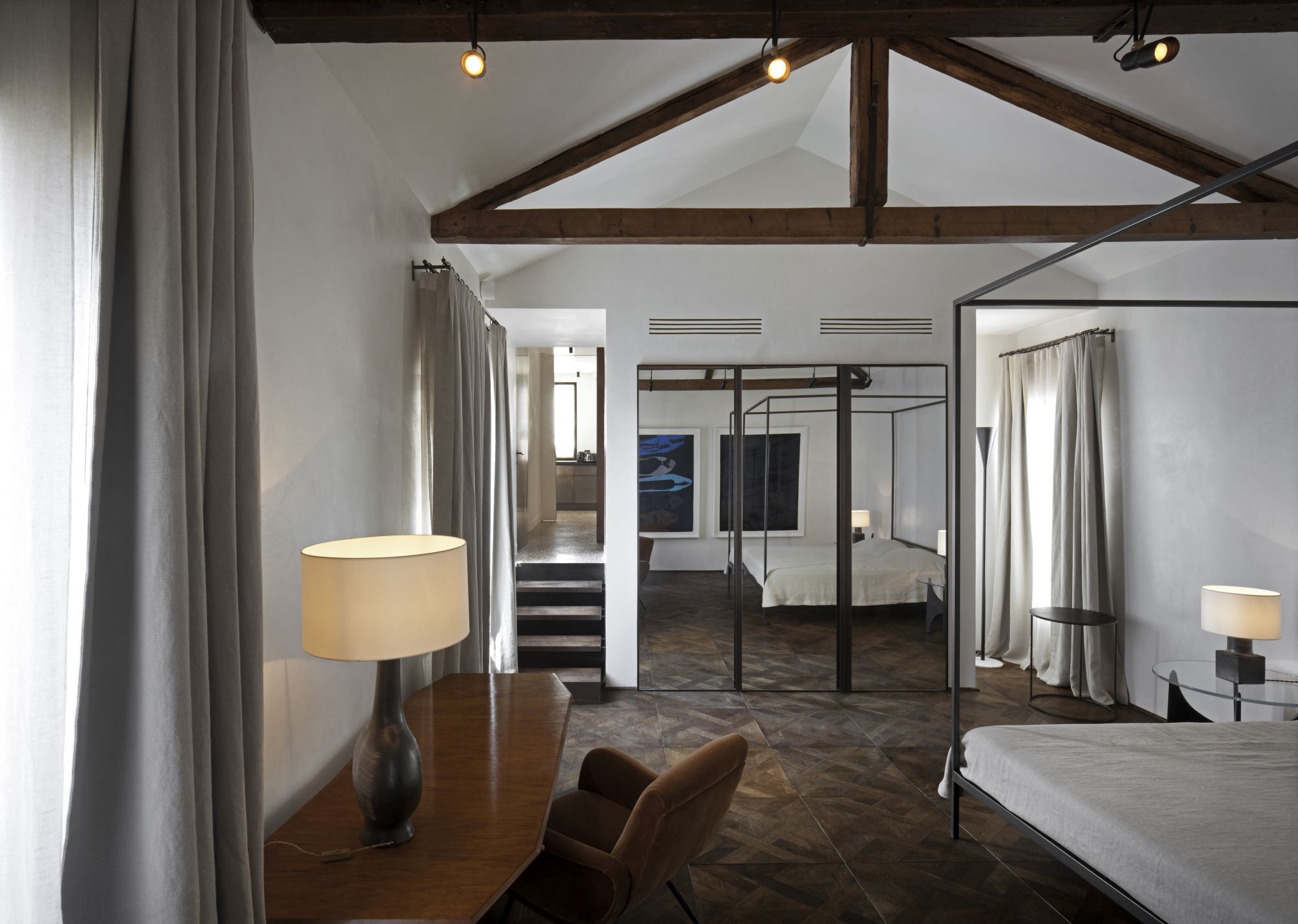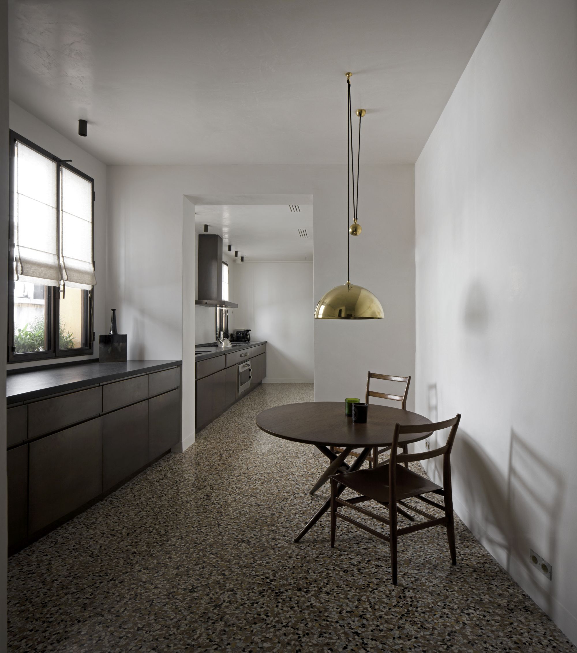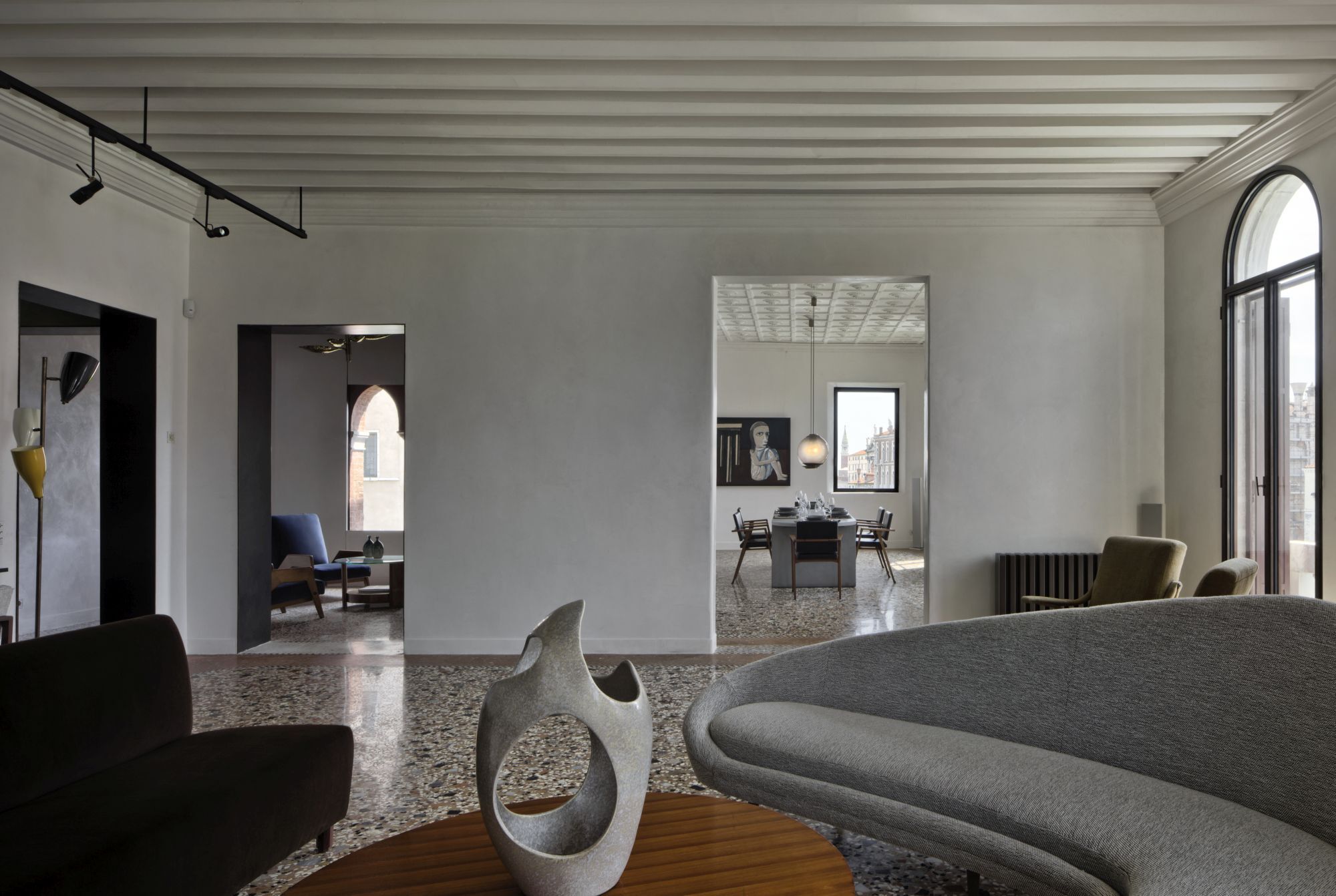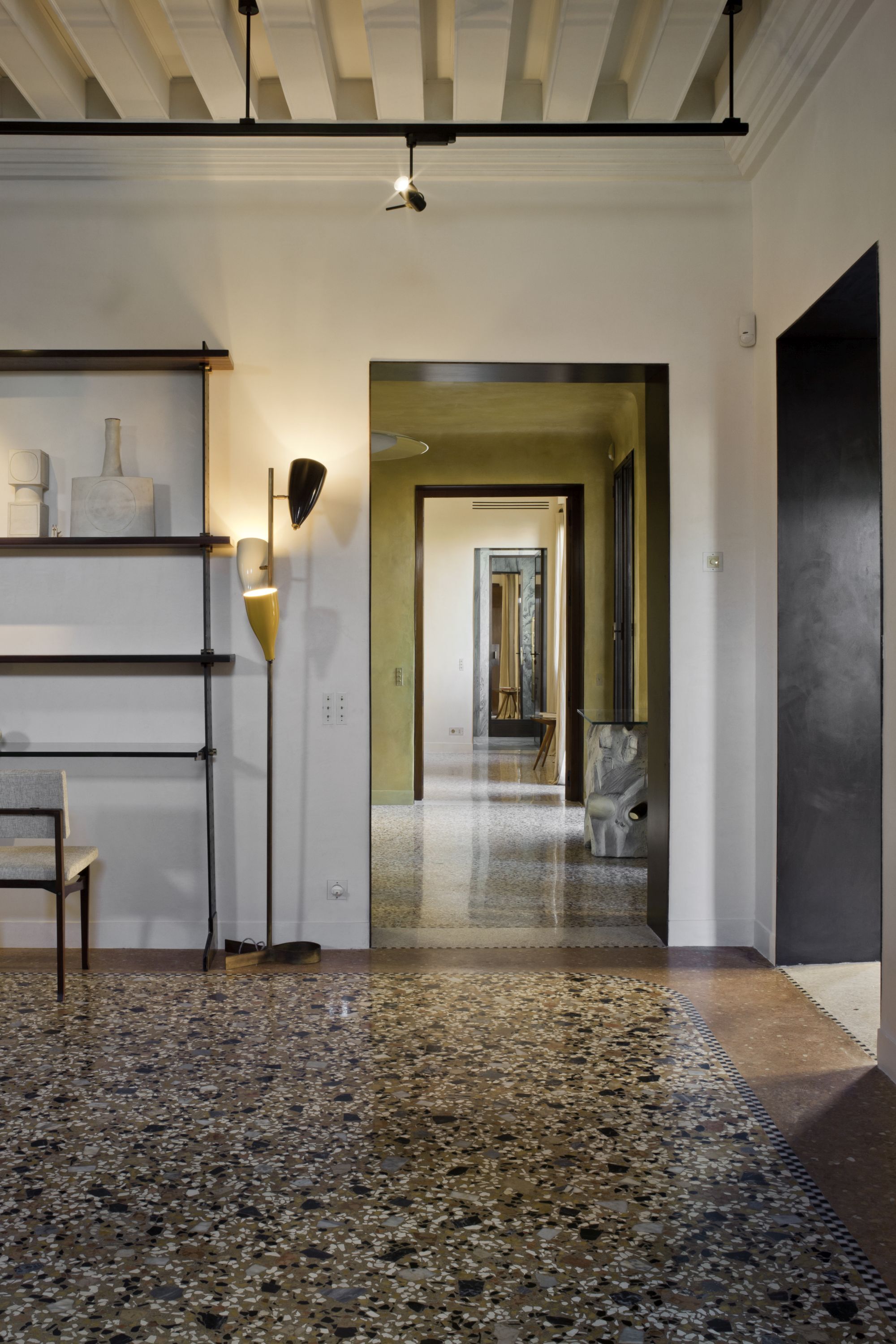 Renovation of a residential unit in Venice, mixing steel frames and precious marbles, pieces of vintage furniture and expressly designed elements.