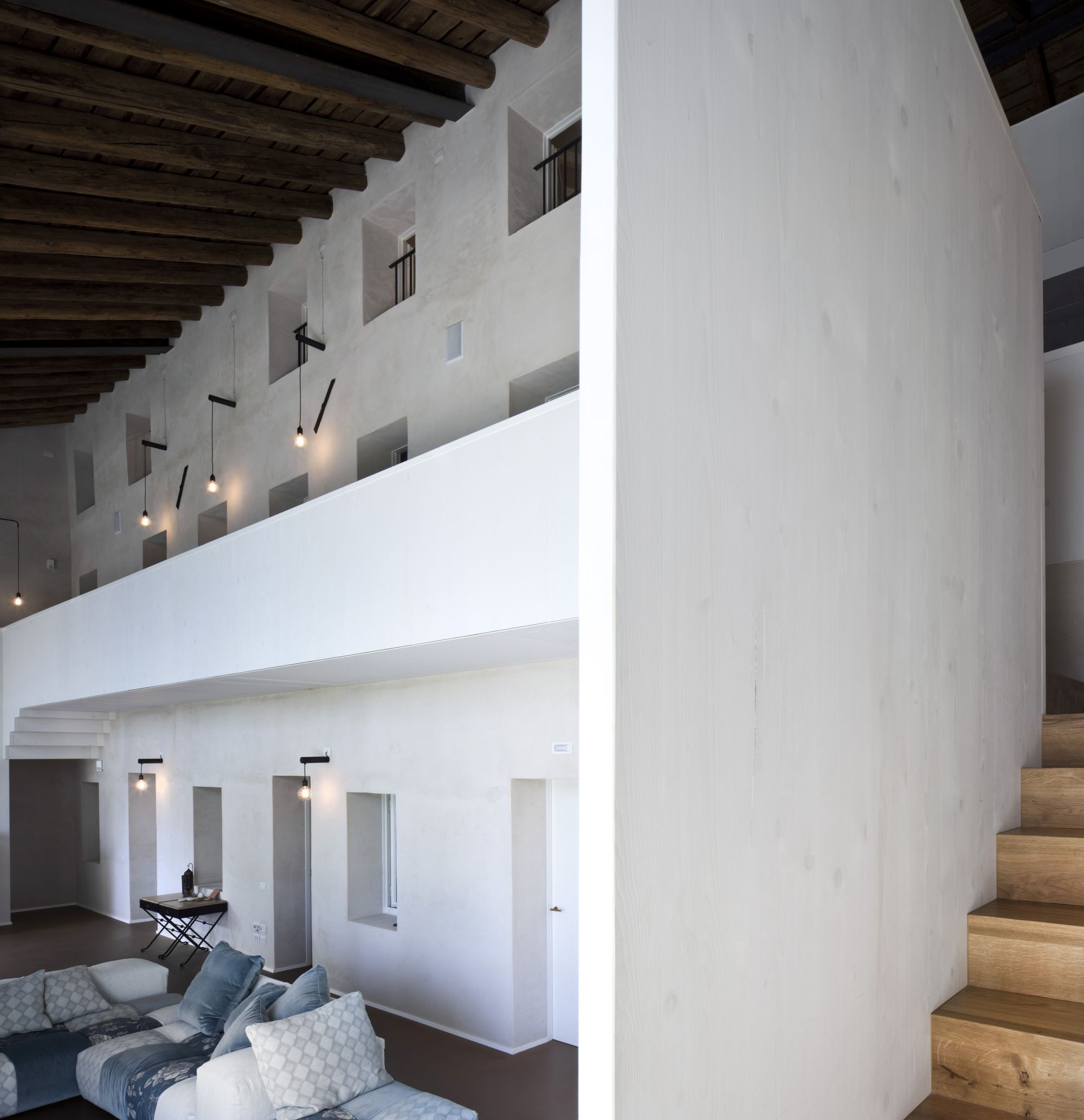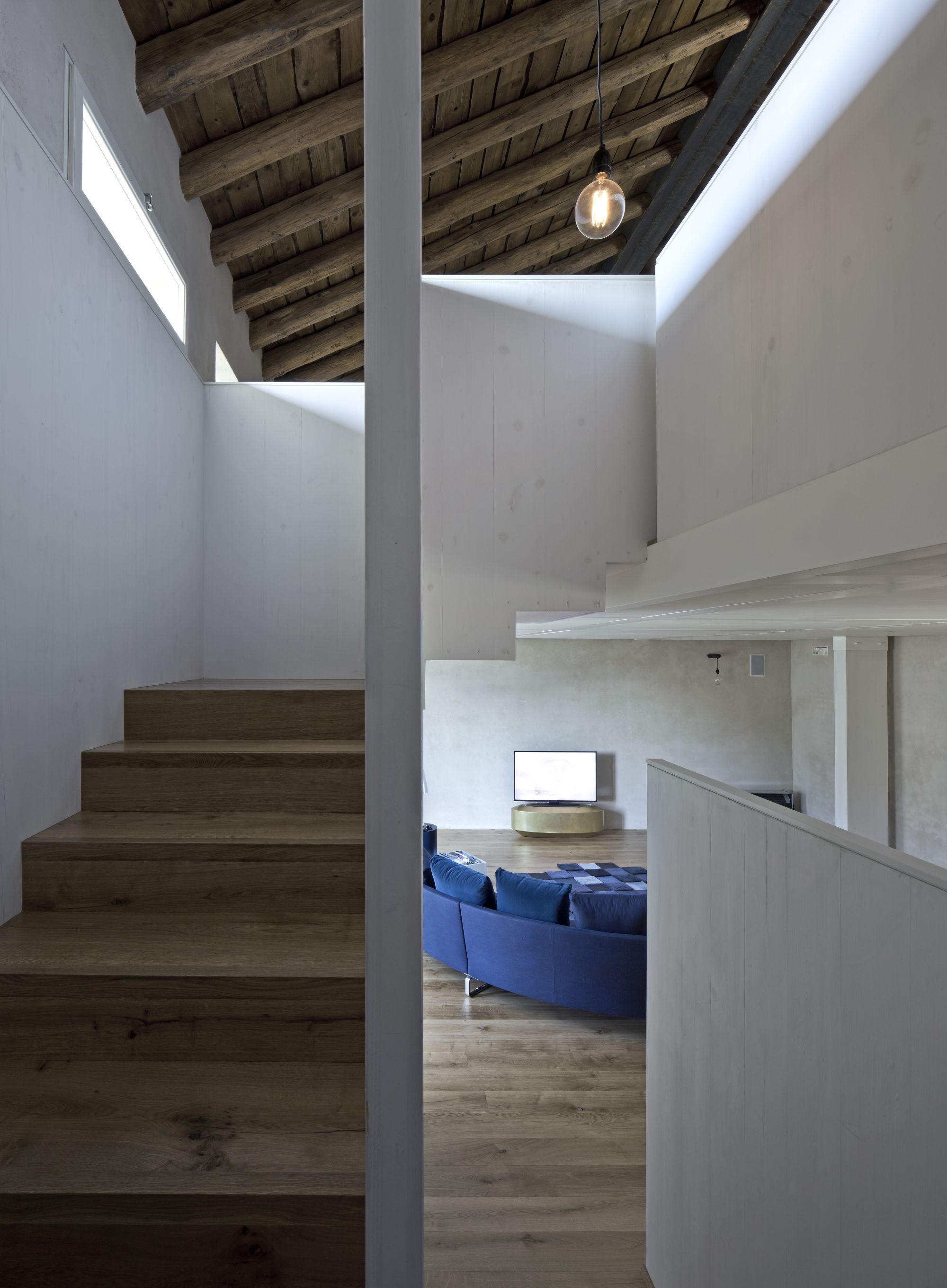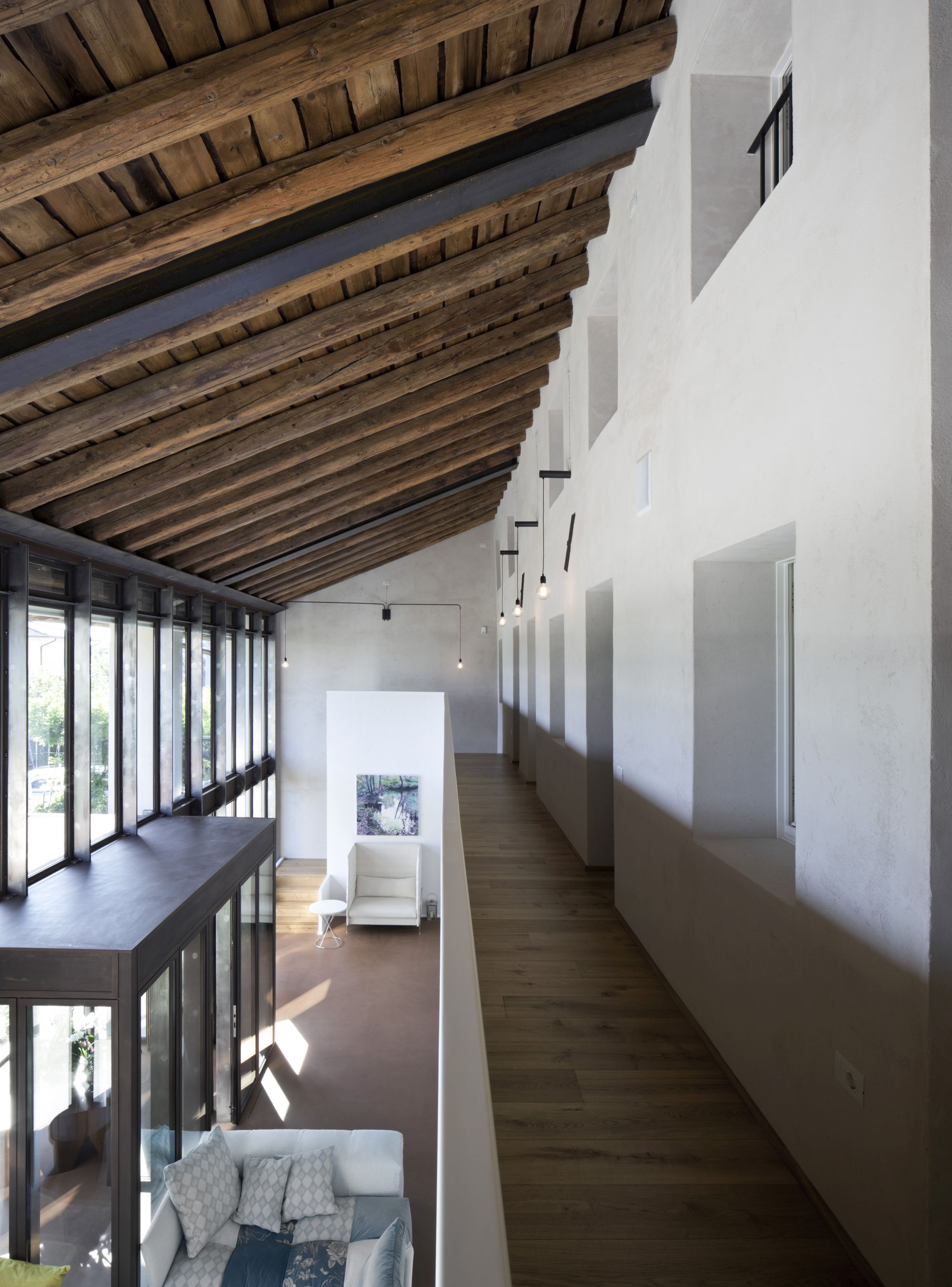 Ristrutturazione di una tipica casa colonica in cui il portico che collegava i due edifici principali è stato convertito in un open space abitativo completamente vetrato.