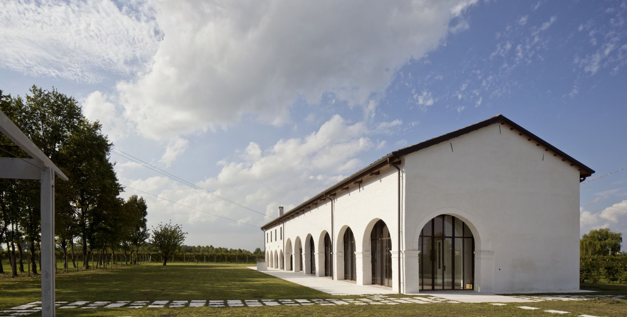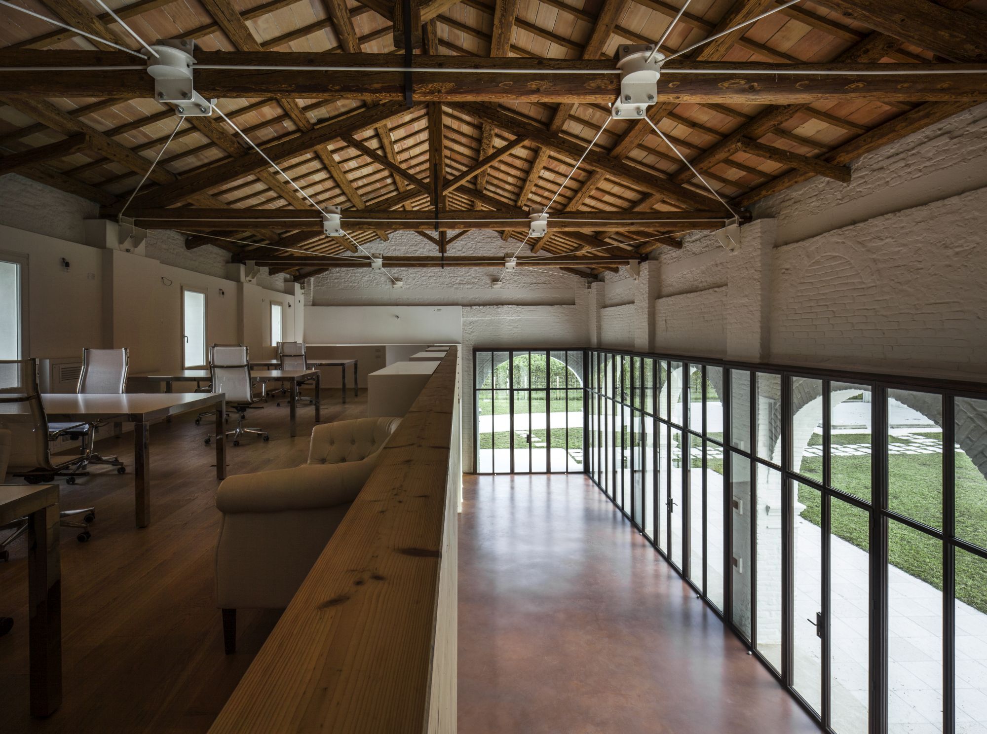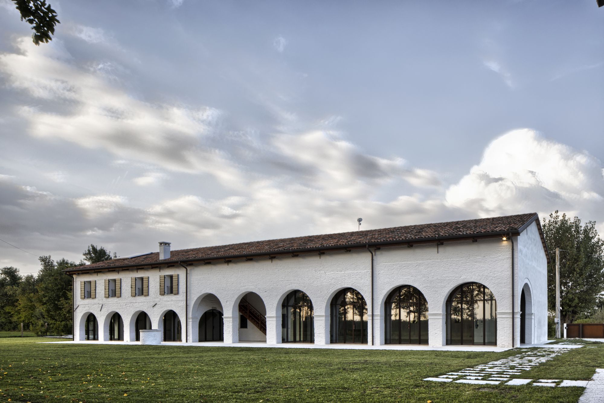 Ristrutturazione di una tipica casa colonica con annesse stalle porticate convertite in uno spazio abitativo completamente vetrato con soppalco.