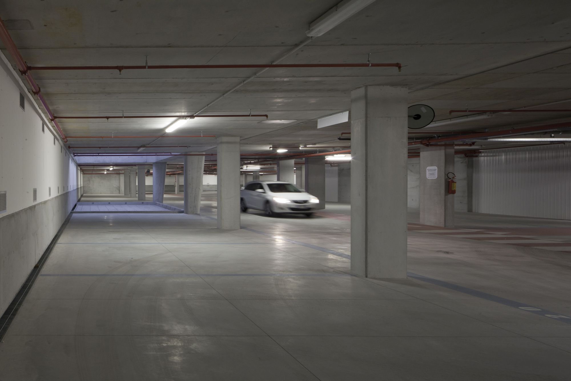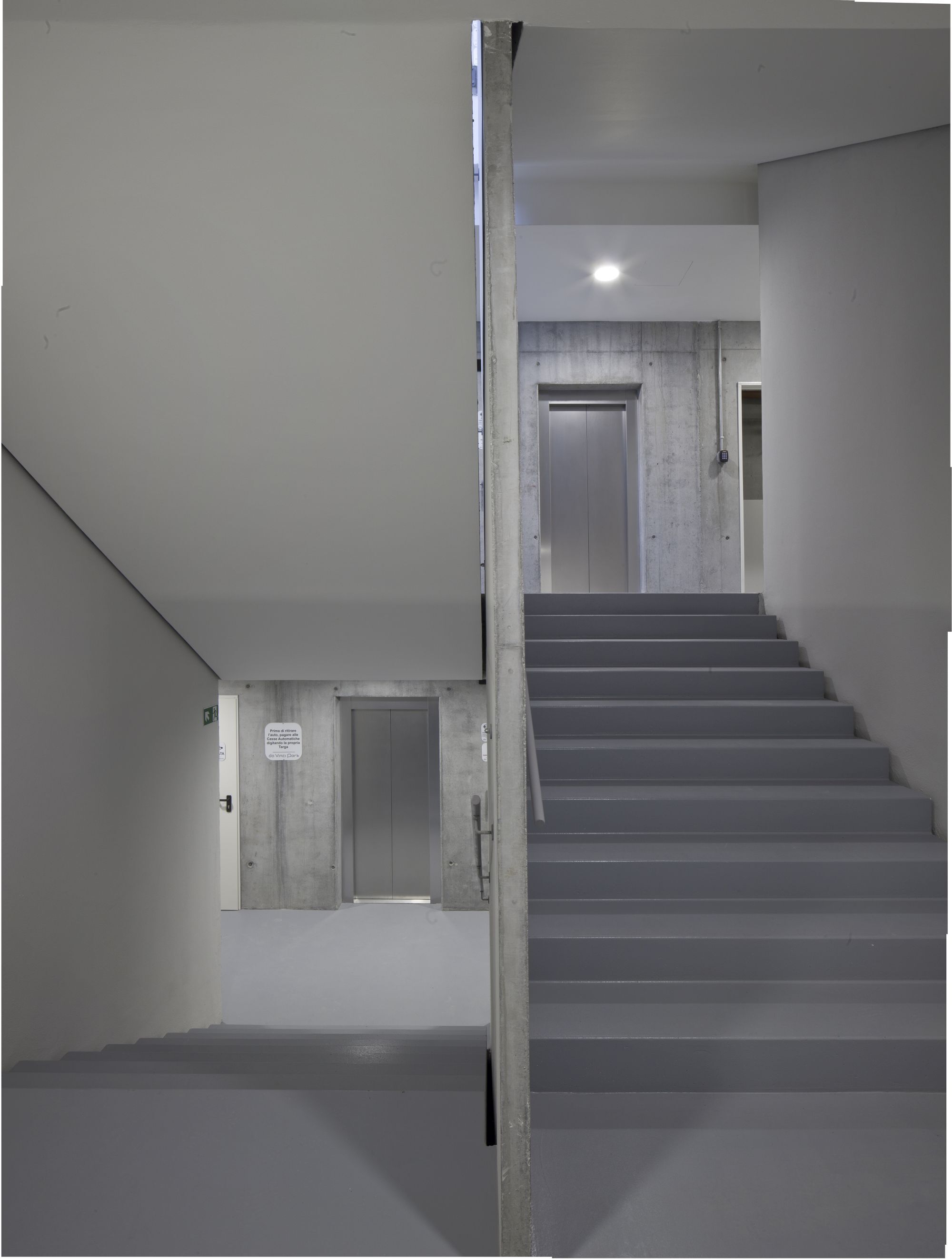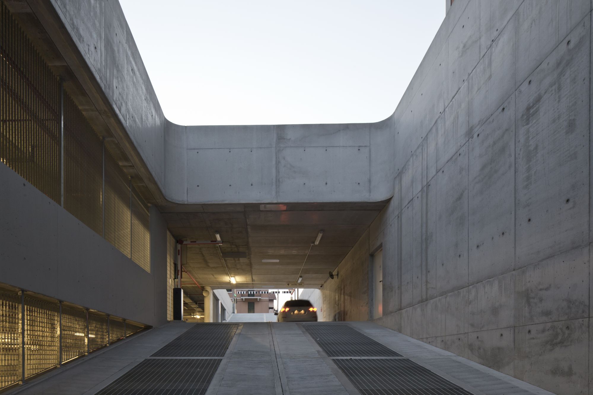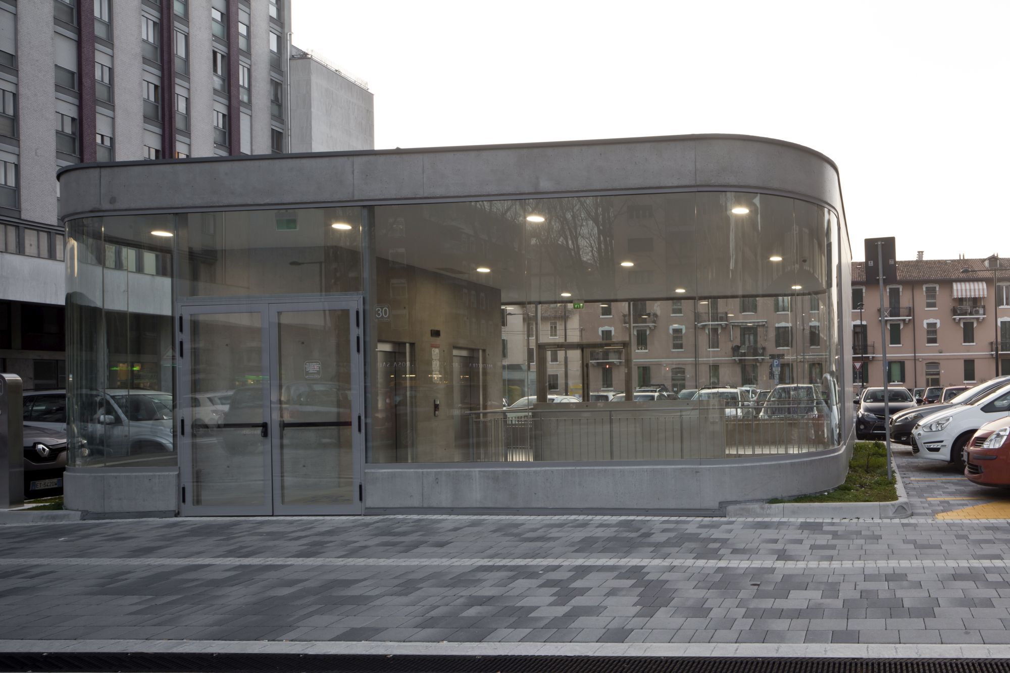 Progettazione paesaggistica di un'autorimessa interrata, che consiste nel concepire l'ingresso pedonale in superficie, le rampe e il sistema di ventilazione come oggetti architettonici in grado di qualificare una piazza altrimenti anonima.