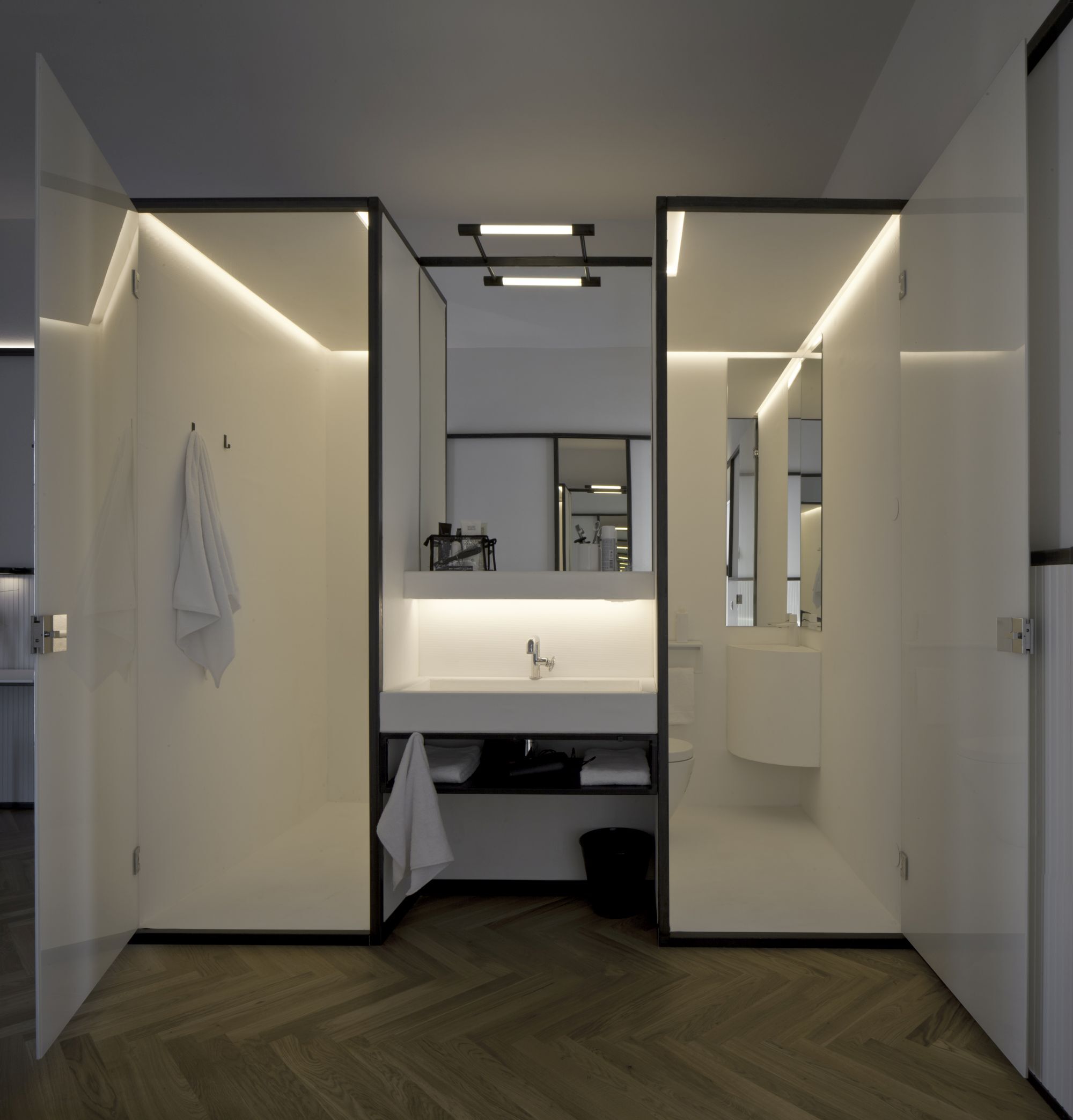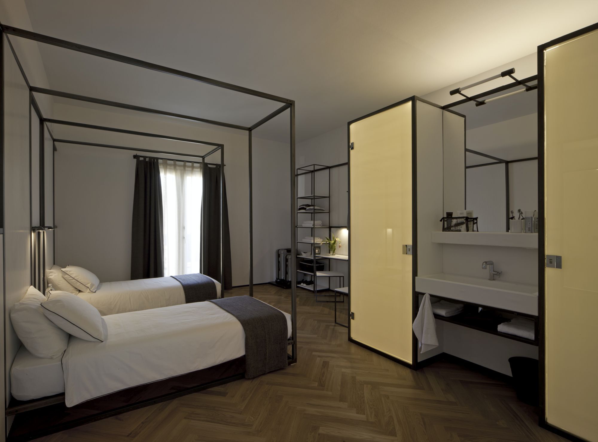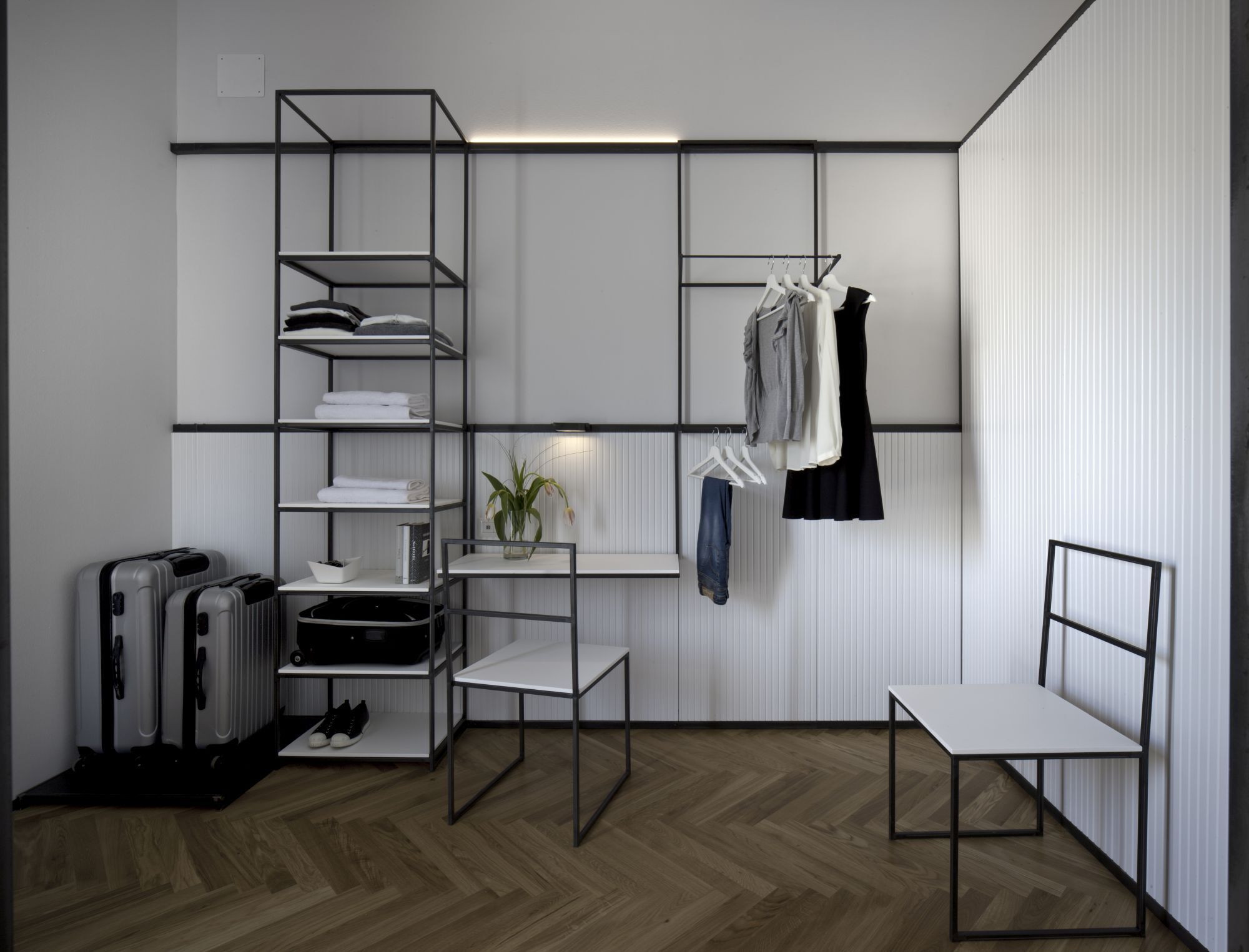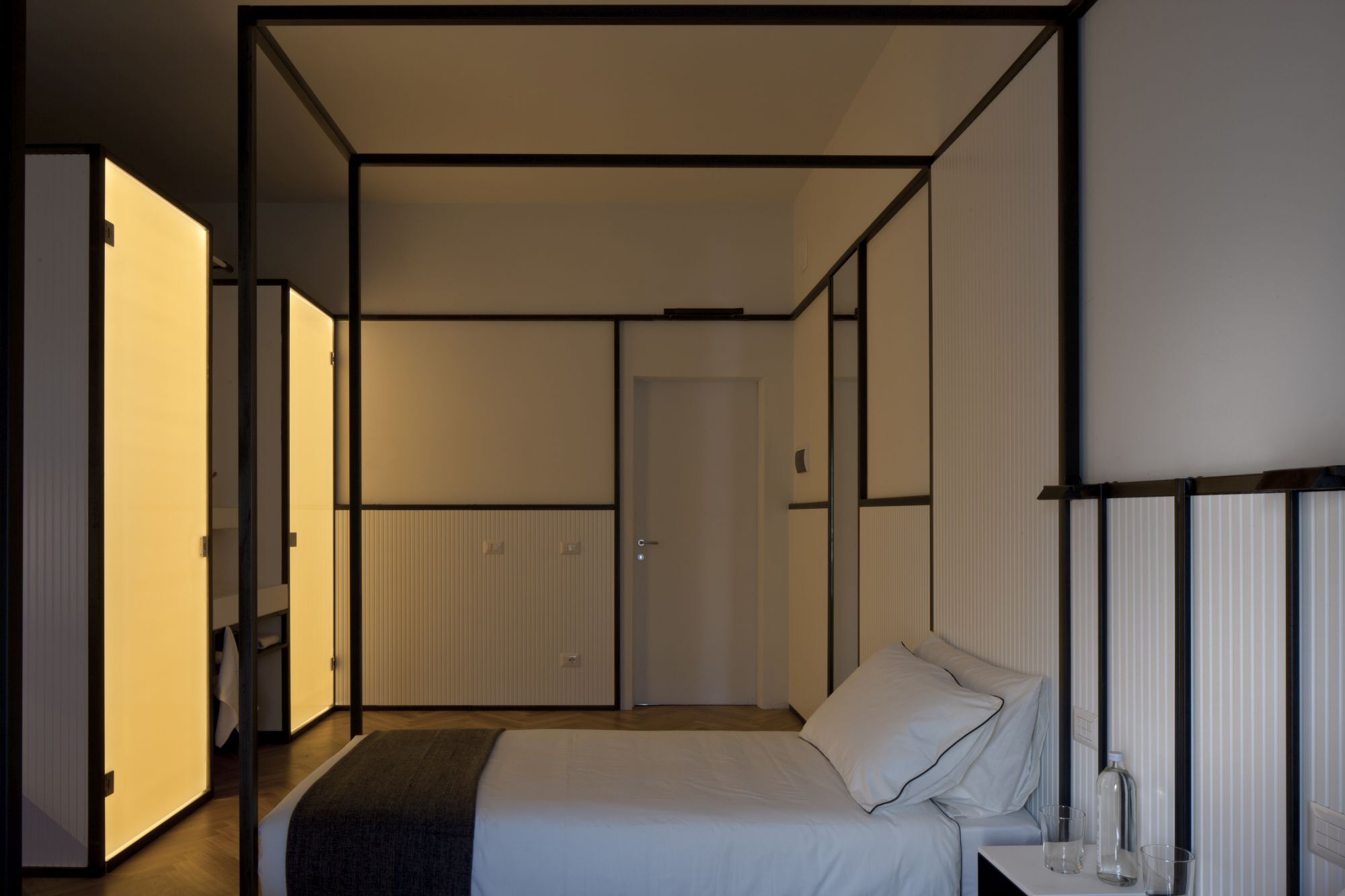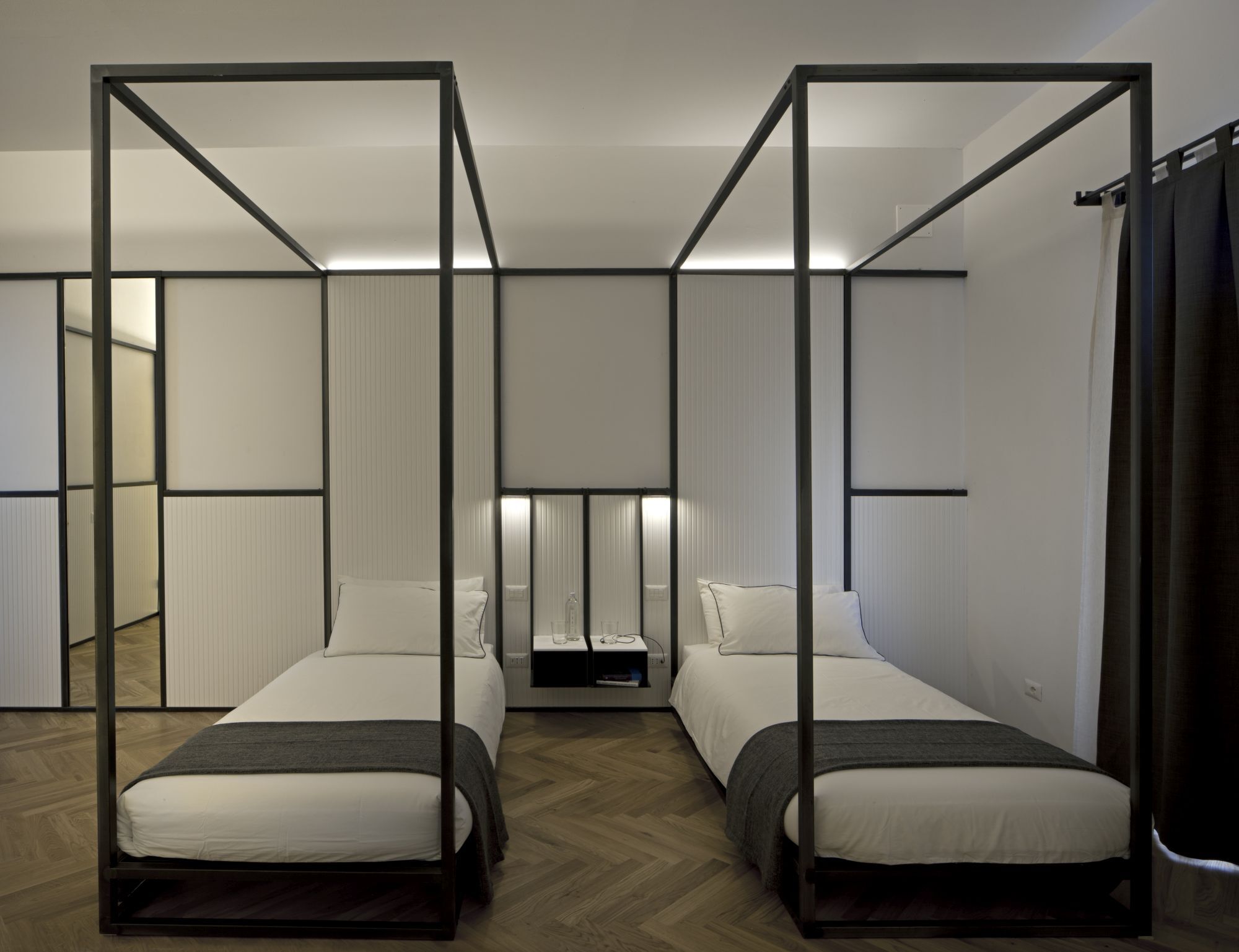 Prototipo di camera d'ostello con servizi integrati.